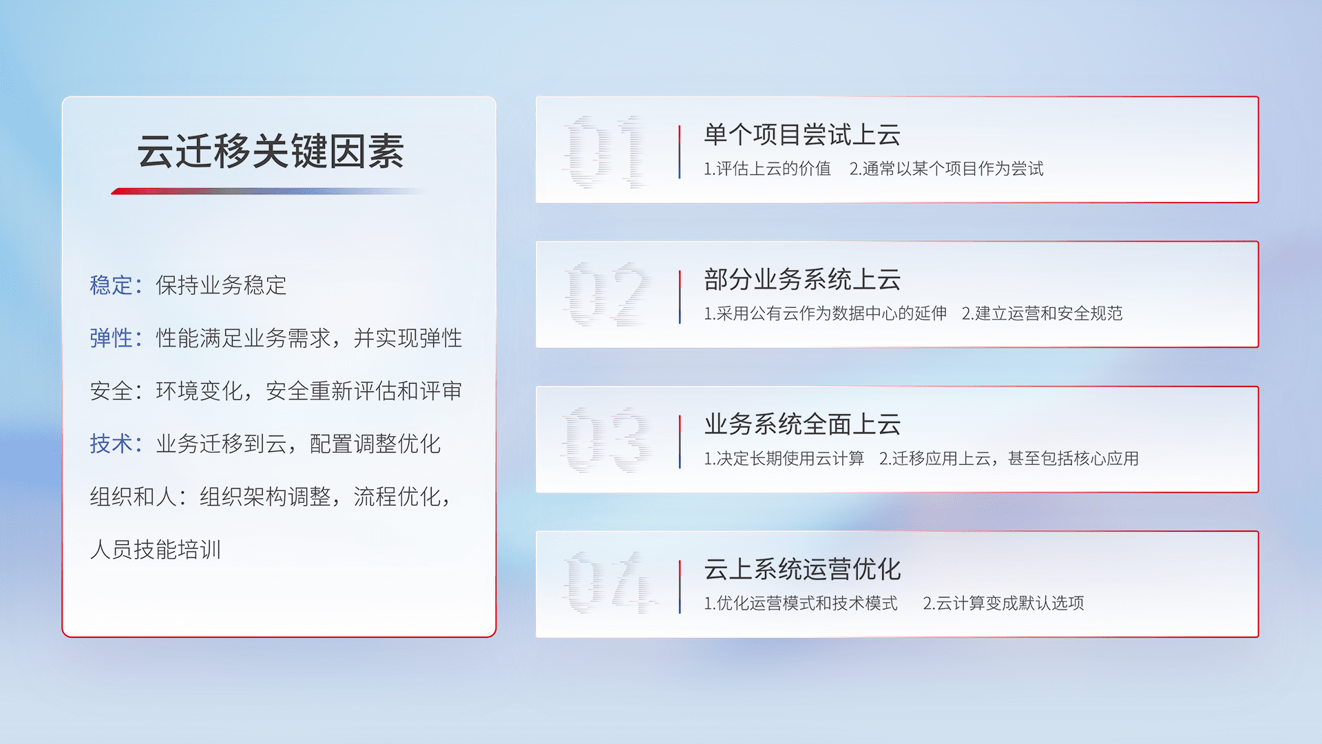 结合实际业务,,,,从规划设计、、、、云平台选型、、云原生改造、、、、数据迁移、、、集成交付,,,,迁移全过程为客户识别最佳上云路径,,,,做好风险识别管理,,,设计网络架构、、、、身份权限、、安全审计合规、、操作审计、、日志审计、、、监控告警策略、、多站点容灾设计等,,,对云上基础设施进行整体规划,,提升IT治理水平,,以满足弹性、、、、高可用、、、高性能的需求。。。。