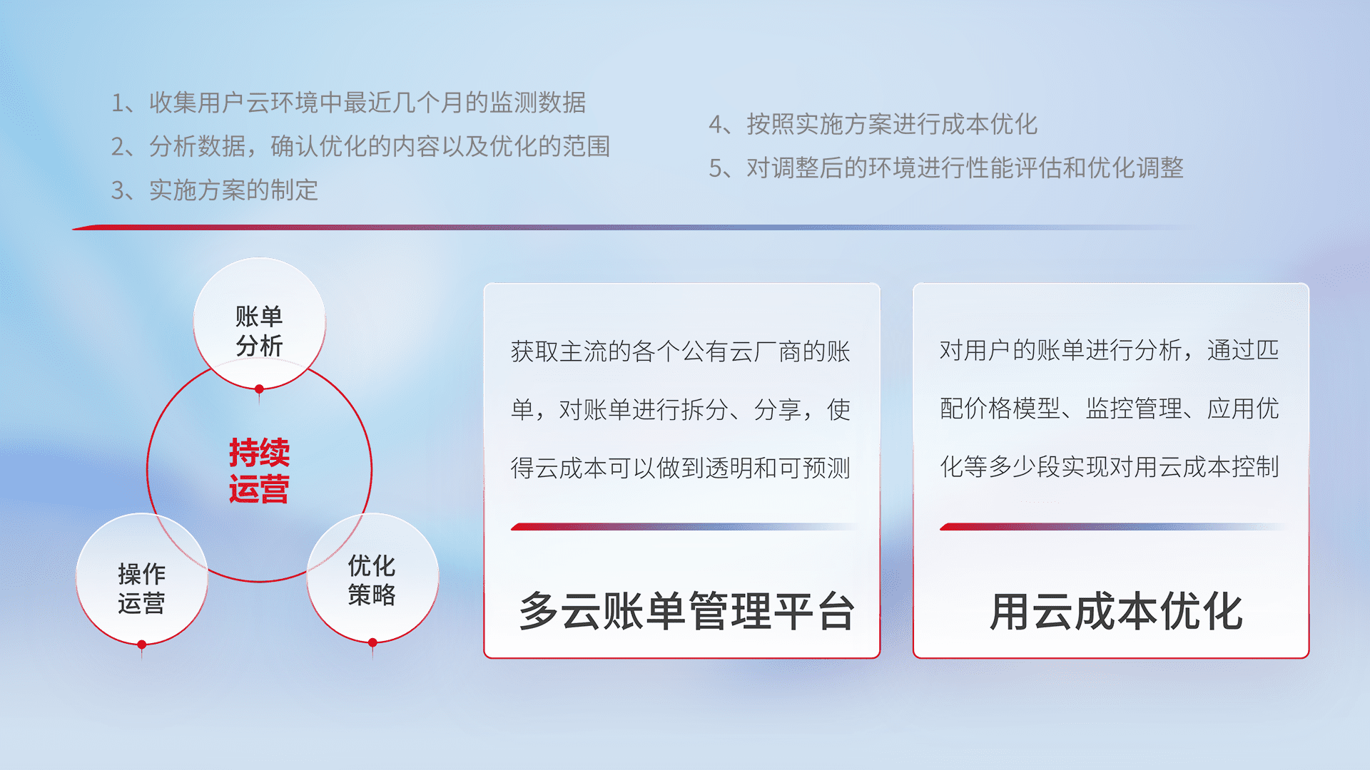 通过多云纳管,,以统一的资源数据模型把客户的云资源进行抽象和封装,,,进而实现对多云资源的统一操作,,,保障云资源管理的可靠性、、、稳定性与可用性。。。。量身定制化运维内容,,,配置、、开发运维、、补丁管理、、、备份、、、监控、、、认证和访问管理、、、、审计和日常巡检等,,,,保障在用云过程中的可靠度,,,稳定度以及高可用率。。